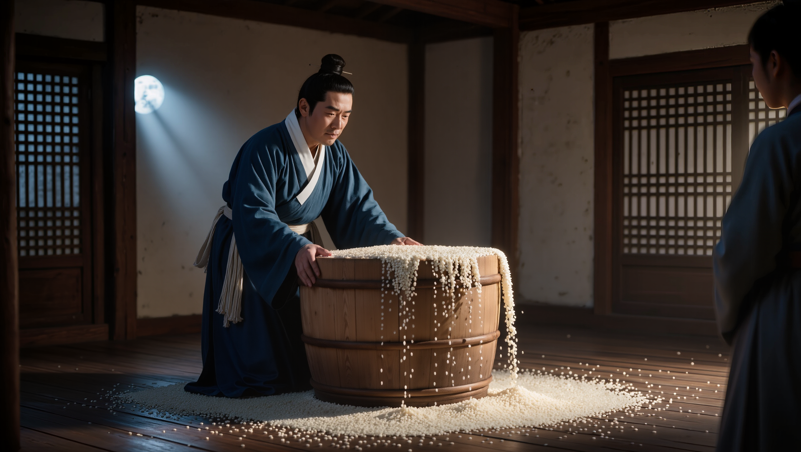 Cinematic shot, dark and eerie atmosphere, Joseon dynasty rice warehouse at night, a greedy merchant Manseok standing in front of a massive rice jar, moonlight streaming through a crack, rice grains falling like golden rain, shadowy figure watching from the corner, high contrast, mysterious and ominous mood, 8k resolution.
