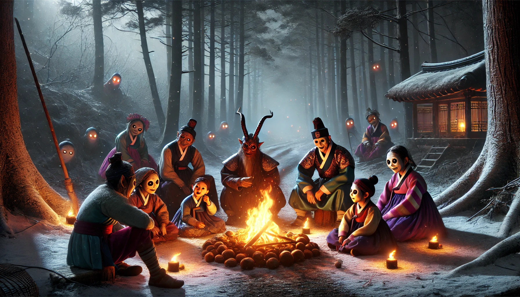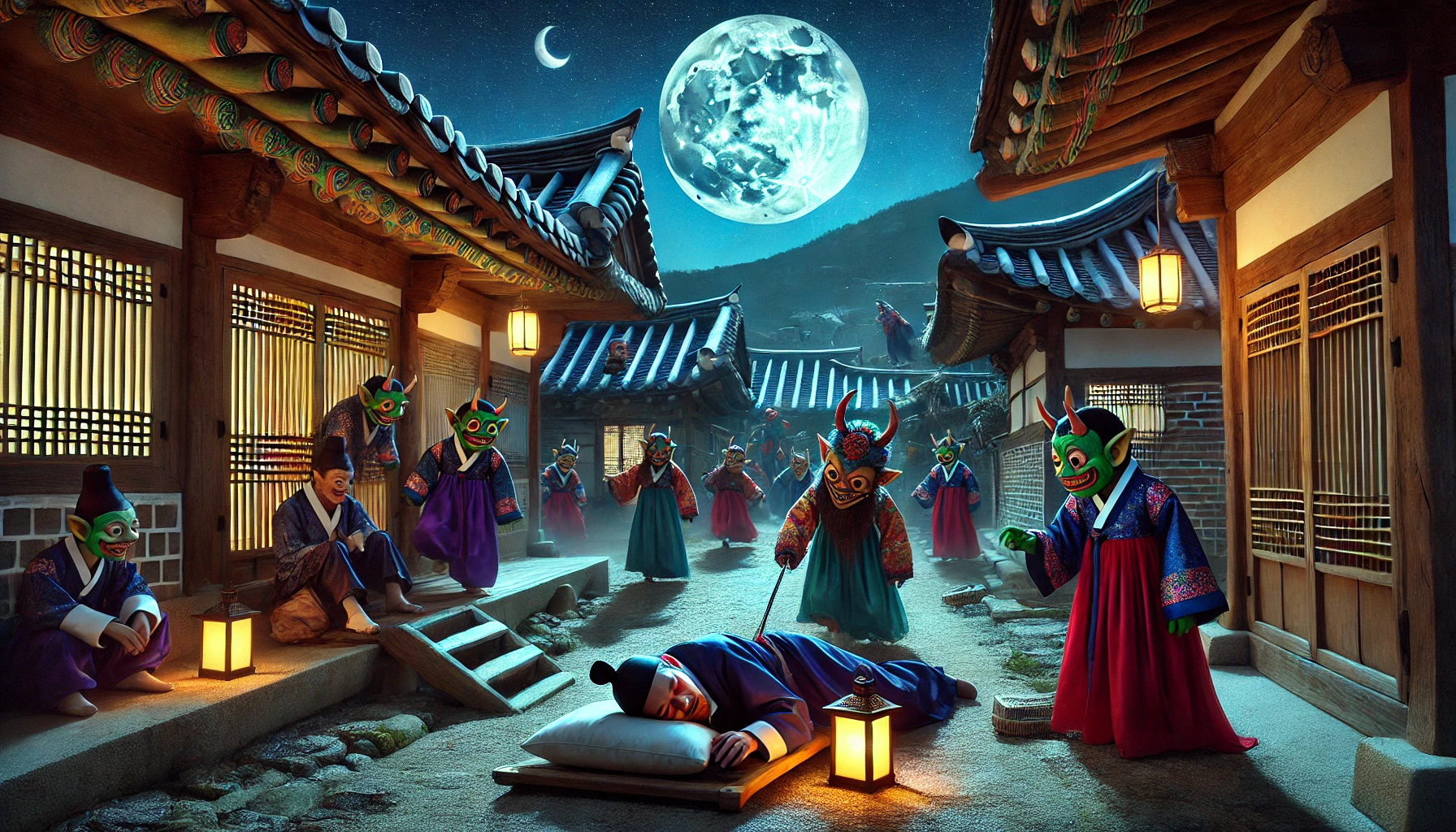 깊은 산속, 인간의 발길이 닿지 않는 곳에 도깨비 마을이 있었습니다. 붉은 도깨비불이 둥둥 떠다니며 마을을 밝히고, 크고 작은 도깨비들이 북적이는 곳이었지요. 이날 밤, 마을 중앙 광장에서는 특별한 회의가 열리고 있었습니다.