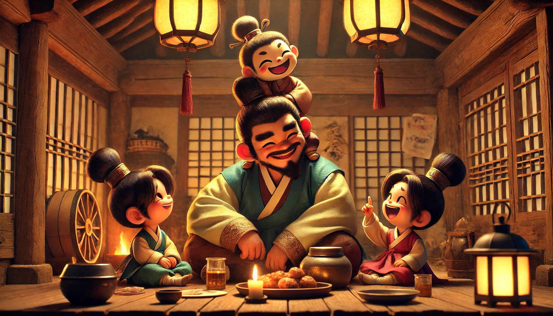 김판서는 벌떡 일어나 호통을 쳤지만, 도깨비들은 오히려 더 크게 웃으며 방 안을 뛰어다니기 시작했다. 노란 도깨비는 김판서의 붓과 벼루를 가지고 놀았고, 푸른 도깨비는 의관을 쓰고 양반 흉내를 내고 있었다. 검은 도깨비는 심지어 김판서의 비단 이불을 끌고 다녔다.