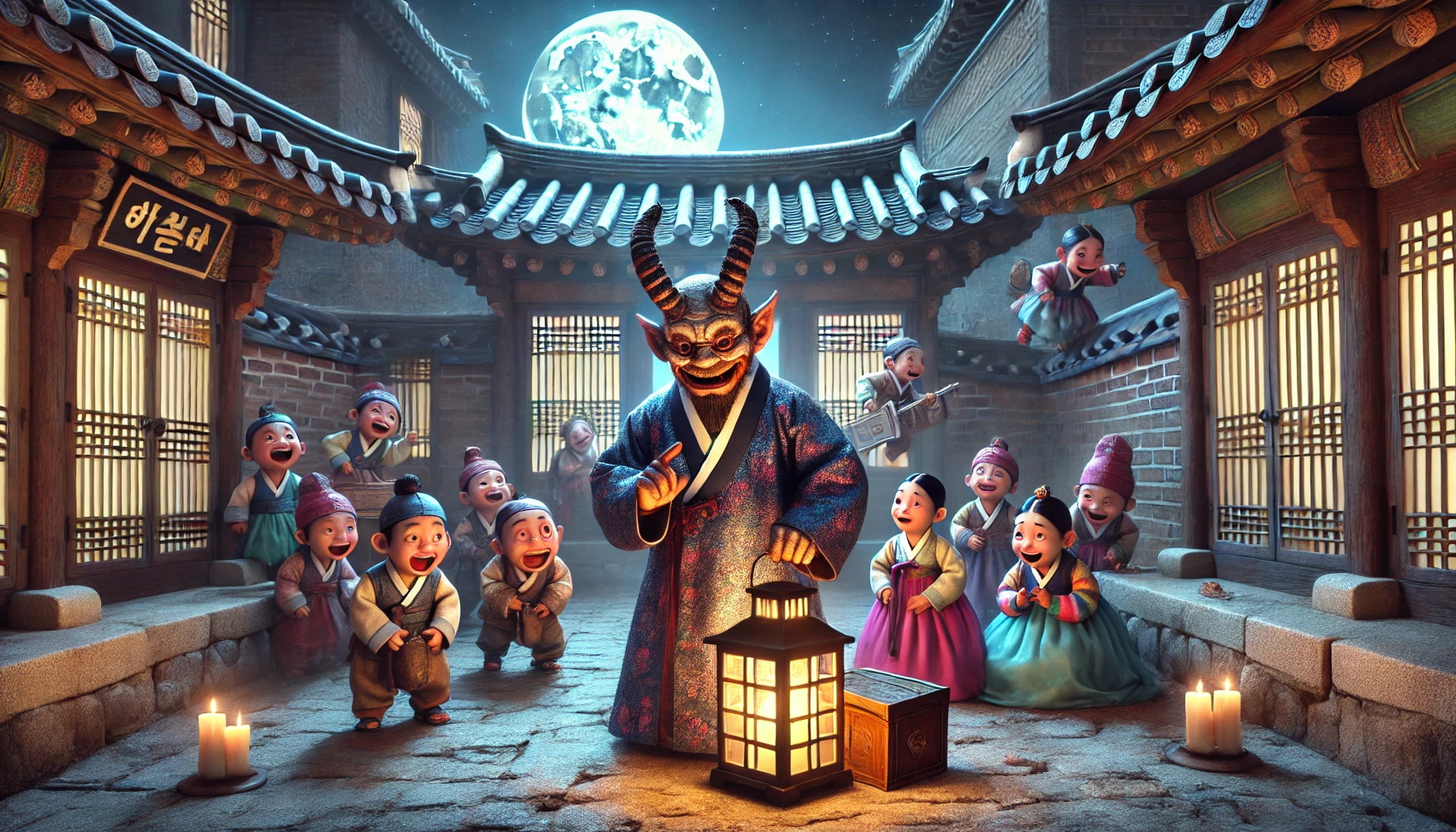 도깨비는 갑자기 김판서의 바로 앞에 나타나 얼굴을 마주했다. 그의 눈은 장난기로 반짝였다.