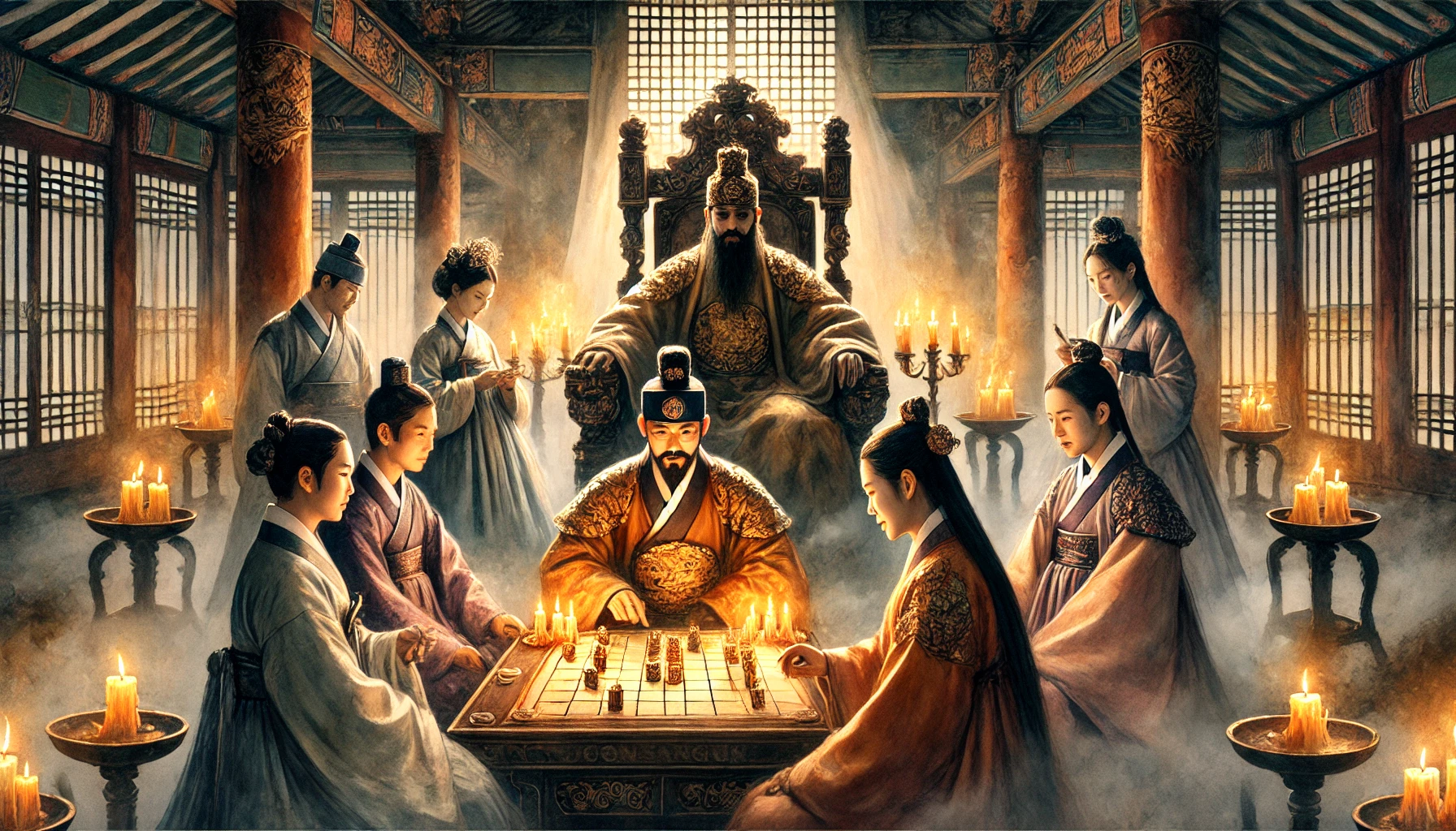 "오늘 밤은 평범한 연회가 아니오. 짐이 직접 고안한 게임을 함께 즐길 것이오. 이 게임은... 여러분의 지혜와 용기, 그리고 충성심을 시험하는 자리가 될 것이오."
