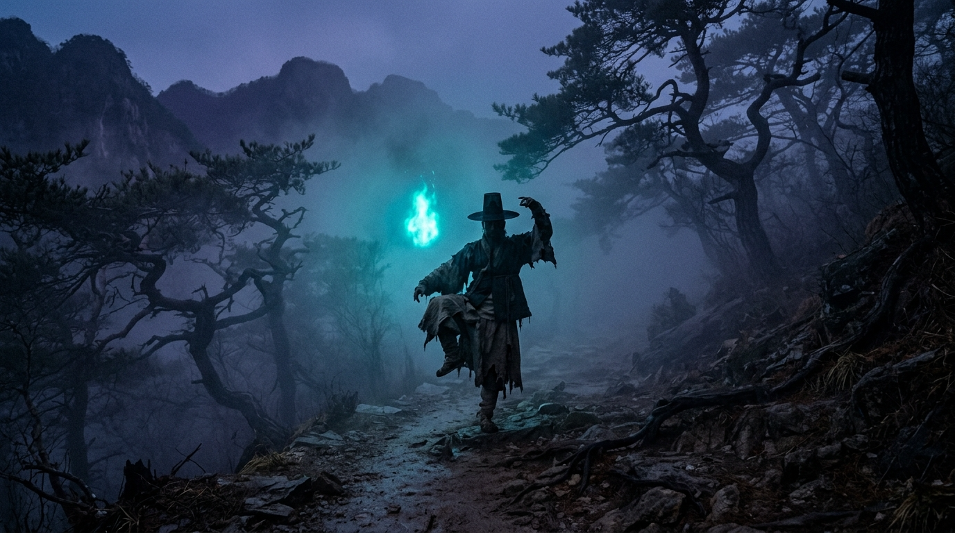 도깨비는 그 자리에 서 있었습니다. 한 다리로, 푸른 빛을 두르고, 고갯마루 한가운데에.