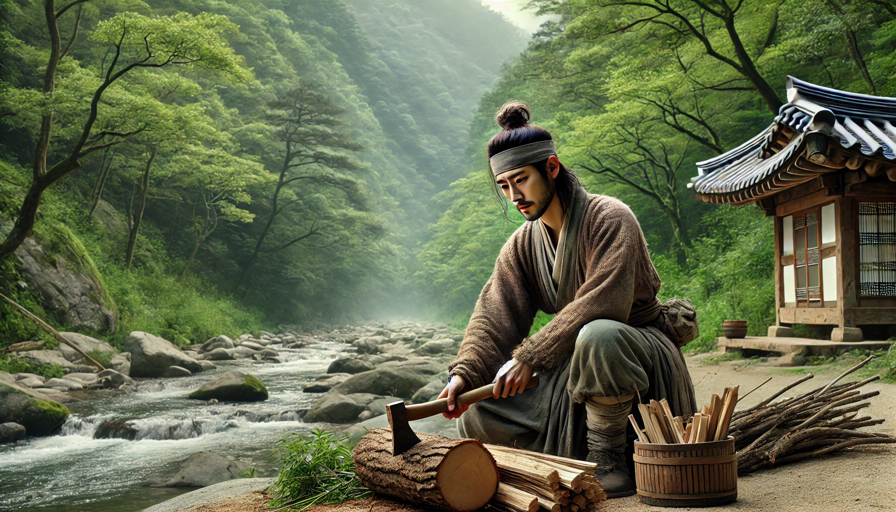 조선 후기, 강원도 깊은 산자락. 이른 아침, 맑은 새소리와 함께 산속의 정적이 깨어납니다. 작은 초가집 앞마당, 도끼를 갈고 있는 소리가 고요한 산중에 울려 퍼집니다.