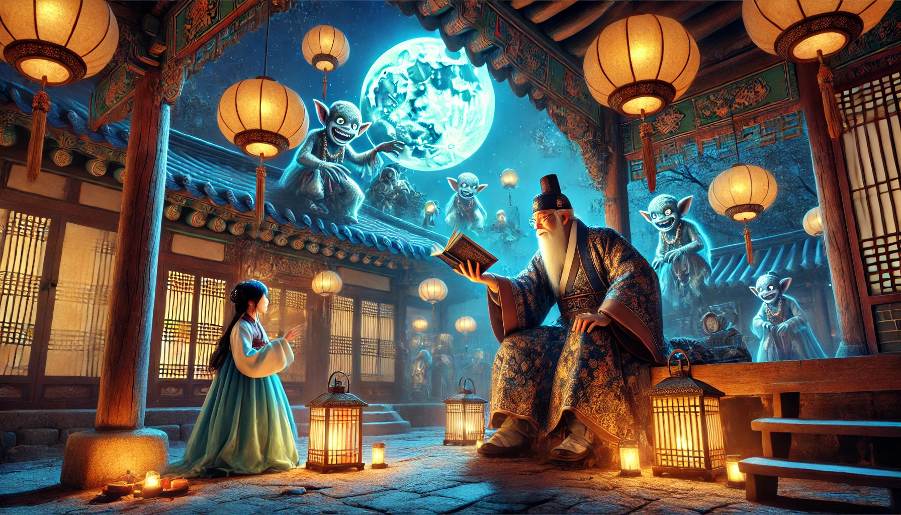 그때였습니다. 창고 안에 갑자기 안개가 피어오르더니, 도깨비들 사이로 한 노인이 나타났습니다. 하얀 수염을 기른 노인은 녹색 도포를 입고 있었고, 손에는 지팡이를 들고 있었지요. 도깨비들이 일제히 고개를 숙였습니다.