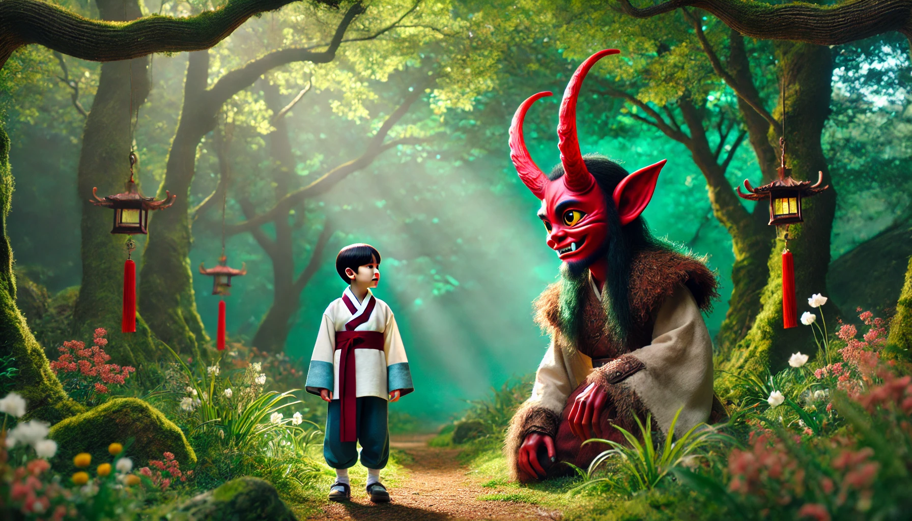 잠시 후, 숲의 깊은 어둠 속에서 붉은 빛이 아른거리기 시작했다. 이내, 거대한 형체가 소년 앞에 모습을 드러냈다. 그는 머리 양쪽에 붉은 뿔을 가진 도깨비였다. 눈은 번뜩였고, 손에는 커다란 방망이가 들려 있었다.