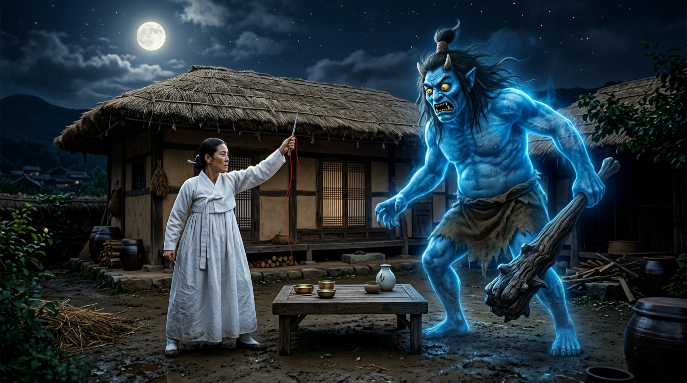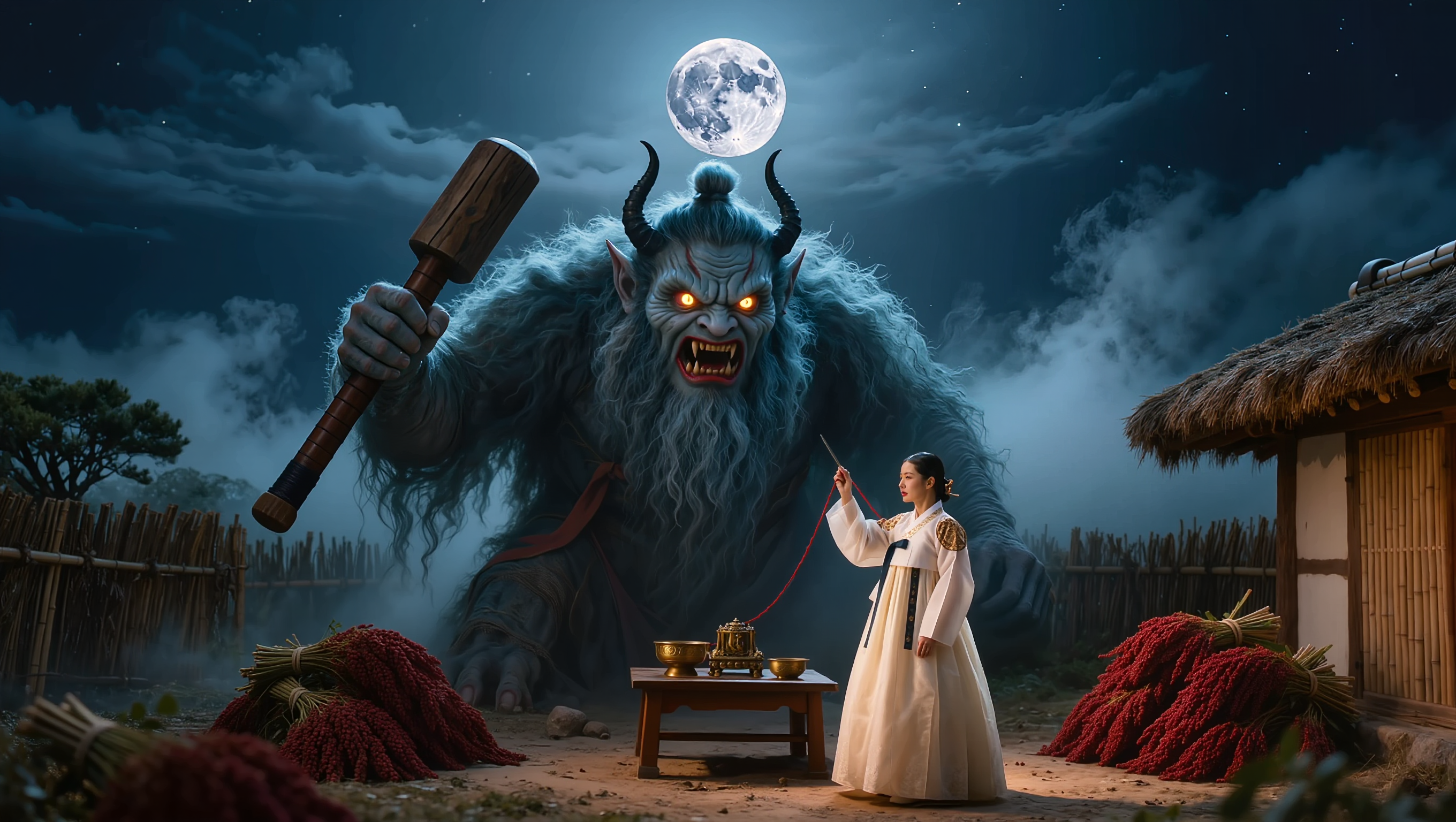 A dramatic photorealistic scene set in Joseon Dynasty Korea at night under a bright full moon. A brave Korean widow woman in traditional white hanbok stands defiantly in the courtyard of a small thatched-roof cottage, holding up a long sewing needle with red thread in her right hand. Facing her is a towering supernatural dokkaebi (Korean goblin) with a bluish glowing body, wild hair with a horn-like topknot, fierce yellow glowing eyes, and a massive wooden club in one hand. The dokkaebi appears startled and recoiling slightly. Between them sits a small wooden table with brass bowls and metalwork. Red sorghum bundles are placed around the courtyard corners. Bamboo fence surrounds the property. Atmospheric moonlight casts dramatic shadows. Cinematic lighting with cool blue tones on the dokkaebi and warm golden tones on the woman. Mist rises from the ground. Ultra-detailed, hyper-realistic, 16:9 aspect ratio, no text, no watermarks, no logos.