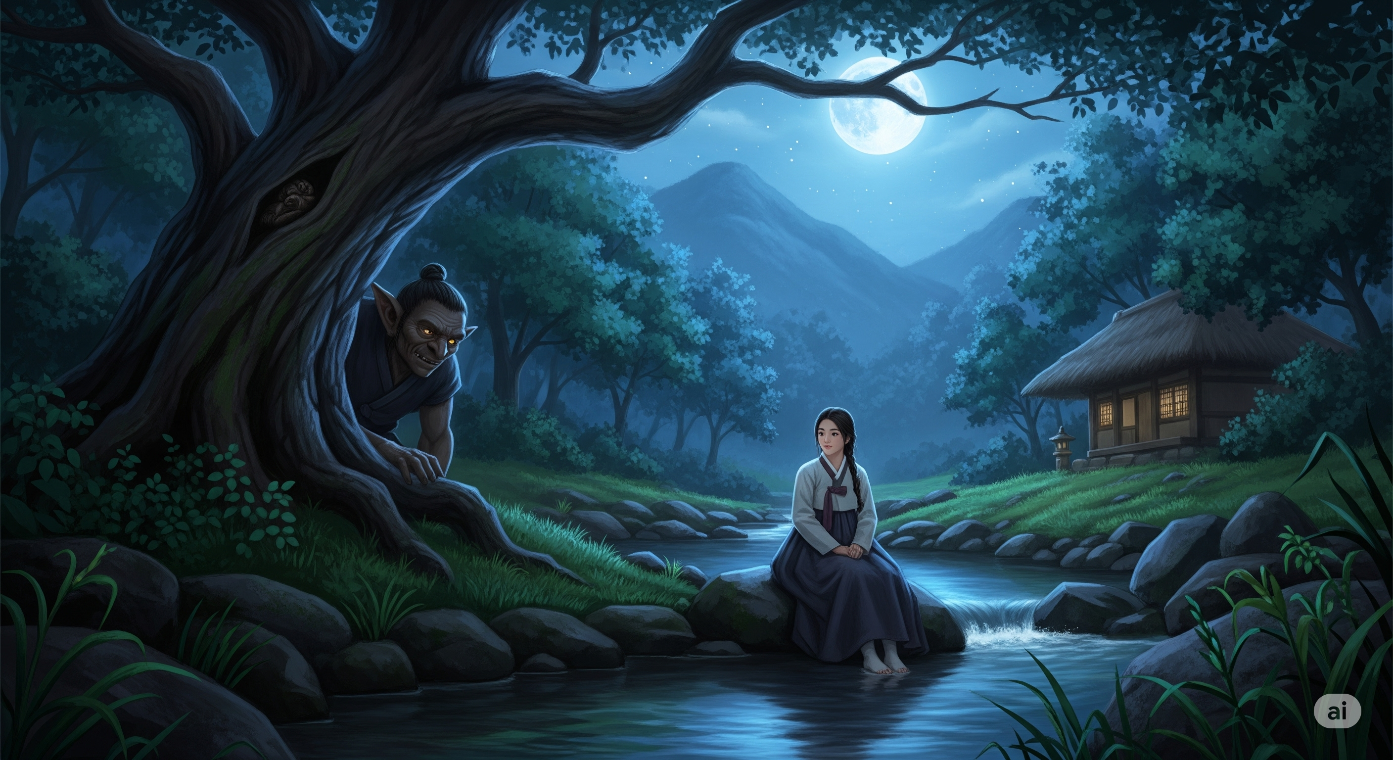피리 소리를 따라 숲 속 깊숙이 들어가니, 조그만 계곡이 나타났습니다. 맑은 물이 흐르고 달빛이 비치는 그곳에서, 한 사내가 바위에 앉아 피리를 불고 있었습니다.