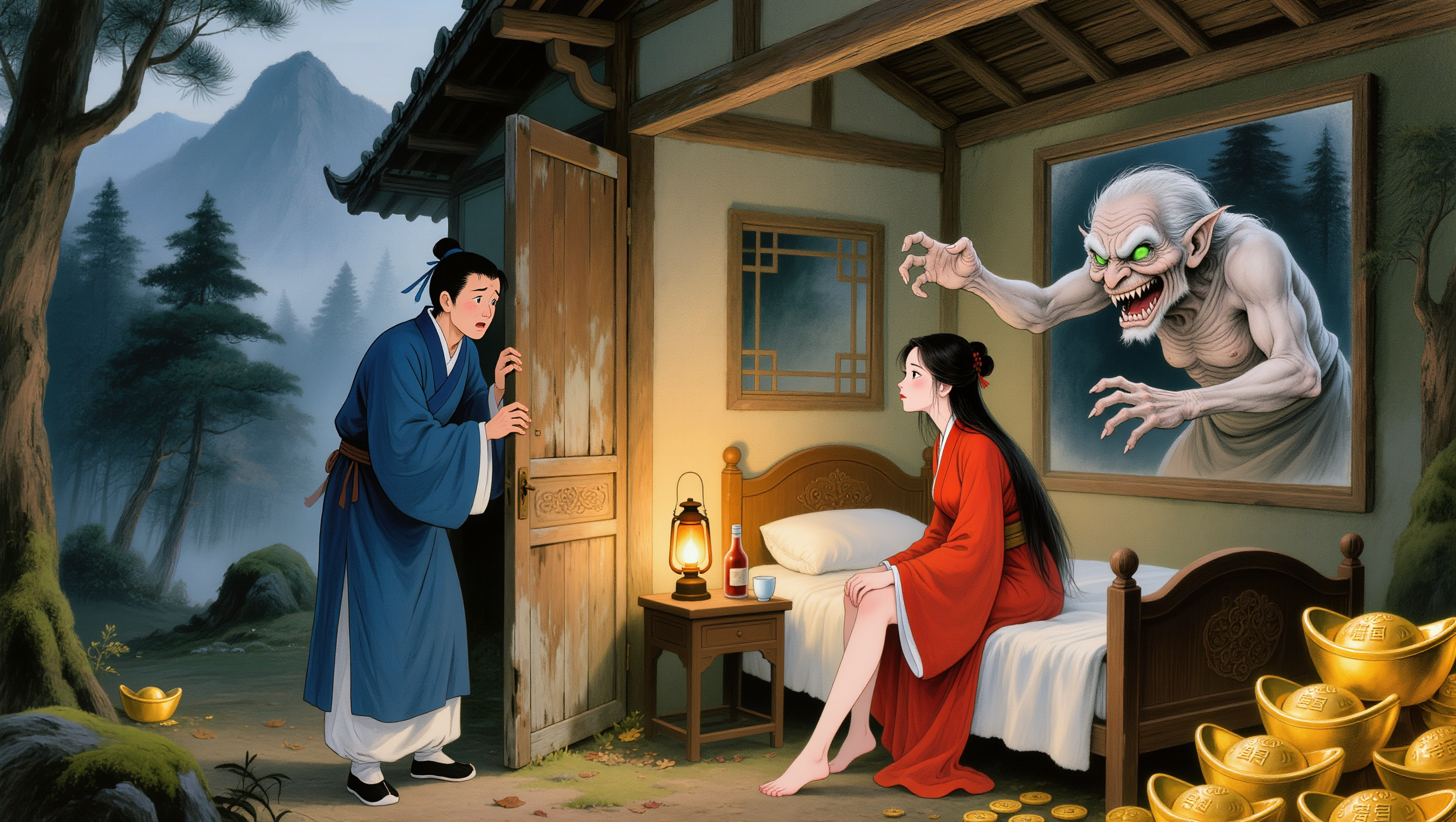 깊은 산속에서 길을 잃은 사내 앞에 할머니 한 분이 나타났습니다. 따뜻한 술과 잠자리를 내어주겠다는 호의. 붉은 술을 마시자 쭈글쭈글한 노파가 눈부신 절세미녀로 변했습니다. 그녀와 밤을 보낼 때마다 진짜 금덩이가 쏟아졌습니다. 사내는 부자가 되었지만 머리카락이 빠지고 얼굴에 검버섯이 돋기 시작했습니다. 어느 비 오는 밤 일찍 도착한 사내가 문틈으로 본 것은, 자신의 정기를 허공에서 뜯어 먹으며 낄낄거리는 할머니의 본모습이었습니다. 거울에 비친 할머니의 정체는 사람이 아니었습니다.