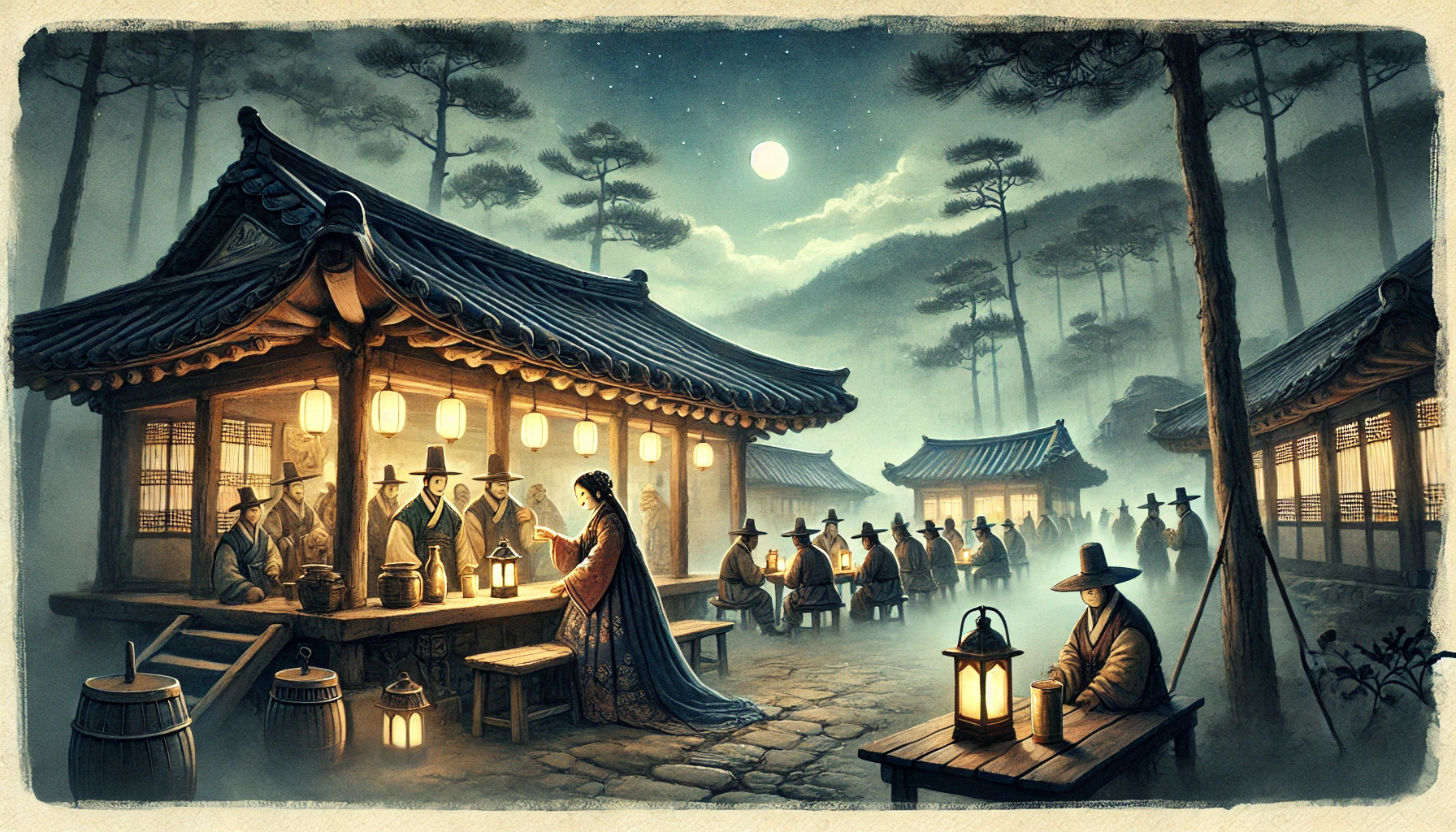 깊은 산속, 달빛만이 은은하게 비추는 고요한 밤이었습니다. 작은 주막 한 채가 외로이 서 있고, 그 안에서는 40대 중반의 주모 옥분이가 하루 장사를 마무리하며 바쁘게 움직이고 있었습니다.