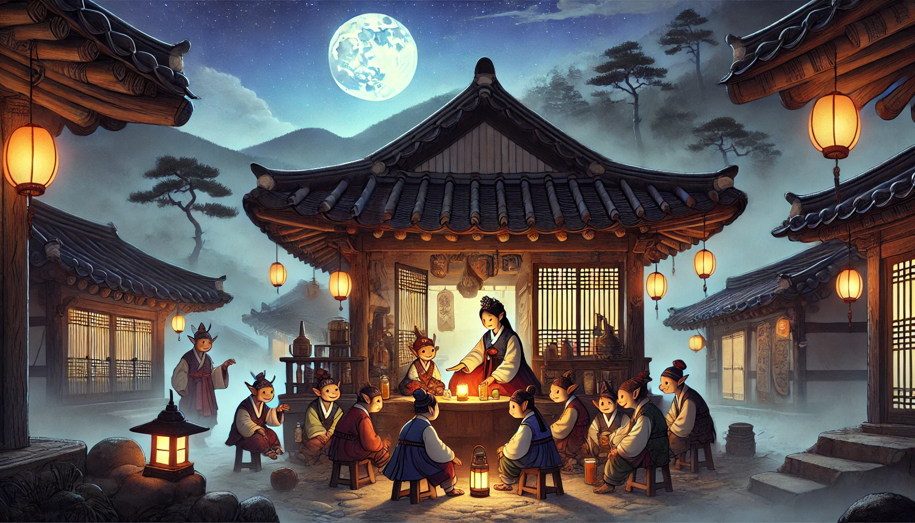 그러자 한 도깨비가 눈물을 글썽이며 말했습니다. "주모님 같은 분을 만난 건 처음이에요. 사람들은 항상 저희를 보면 '귀신이다, 요괴다' 하면서 소리만 지르고 도망가거든요."