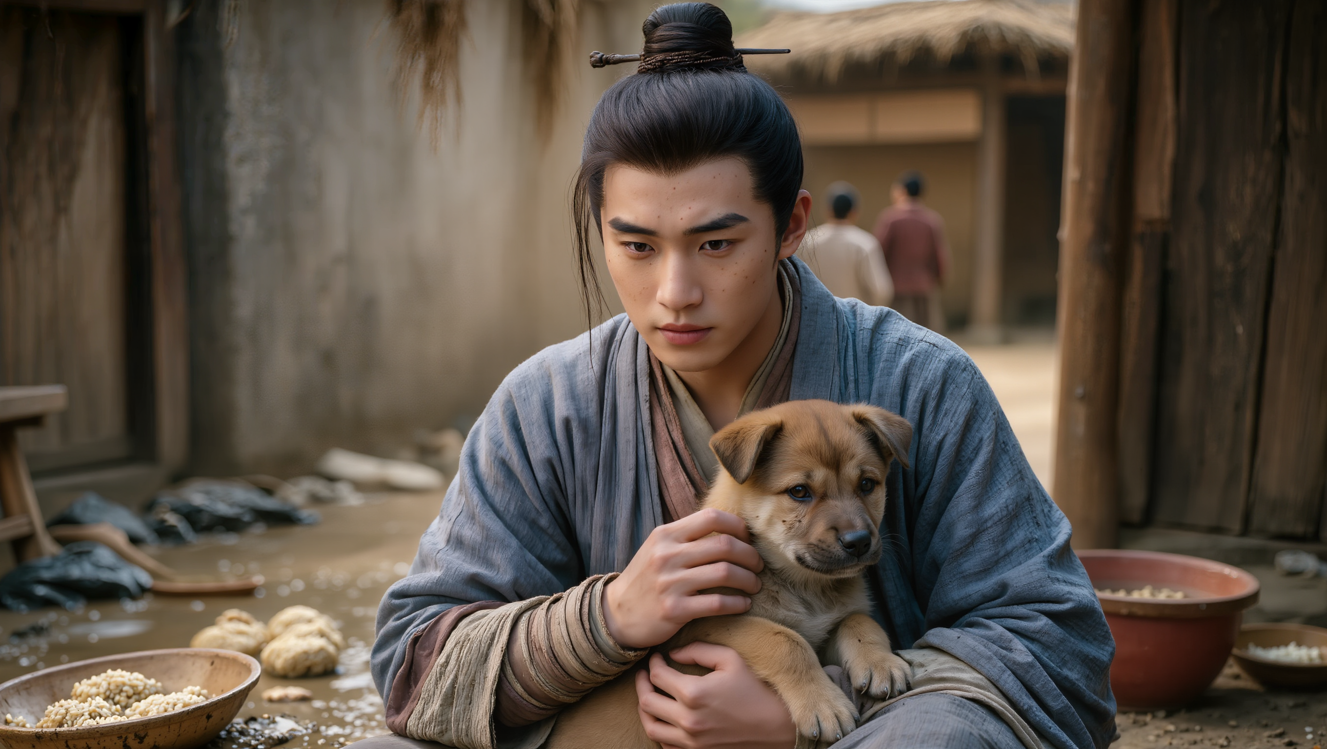바로 그 순간이었습니다. 길손이 복칠이 앞에 무릎을 꿇었습니다. "복칠아." 길손의 눈에서 눈물이 흘렀습니다. 목소리는 이제 백성들을 향한 것이 아니라, 오직 복칠이만을 향하고 있었습니다. "무서워하지 마라. 이제 내가 목숨을 걸고 너를 지켜주마. 황금이 없어도 좋다. 기와집이 없어도 좋다. 그저 너와 내가 다시 그 낡은 폐가 툇마루에 나란히 앉을 수만 있다면." 길손은 복칠이의 얼굴을 두 손으로 감쌌습니다. 사흘간 굶은 차가운 얼굴이었습니다. 하지만 복칠이의 꼬리가 천천히 움직이기 시작했습니다.